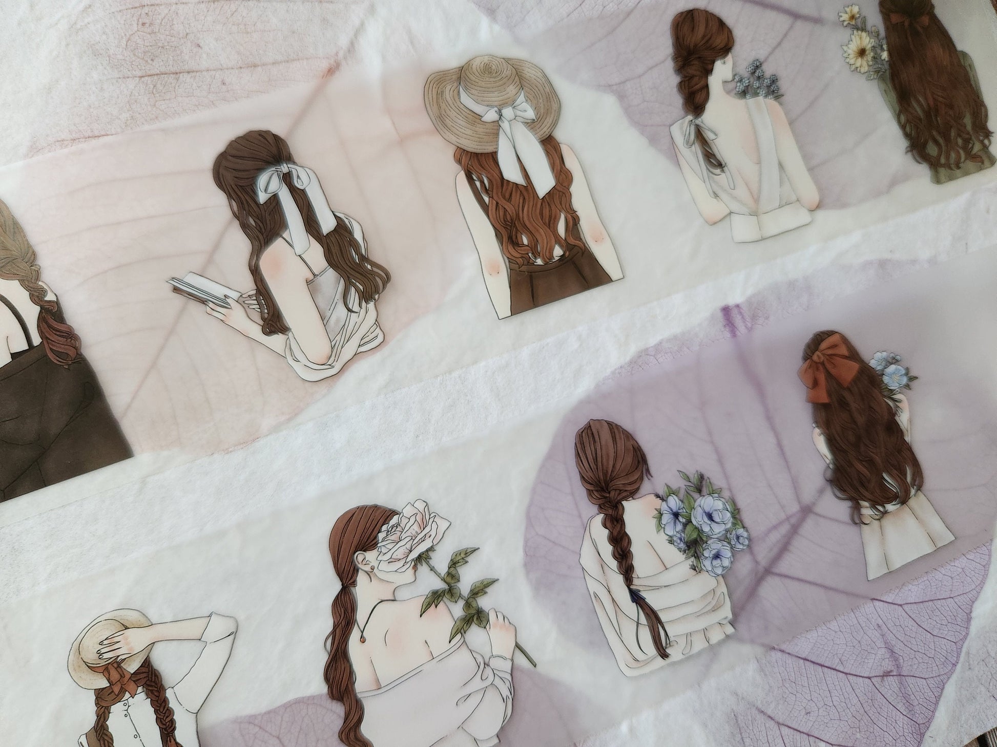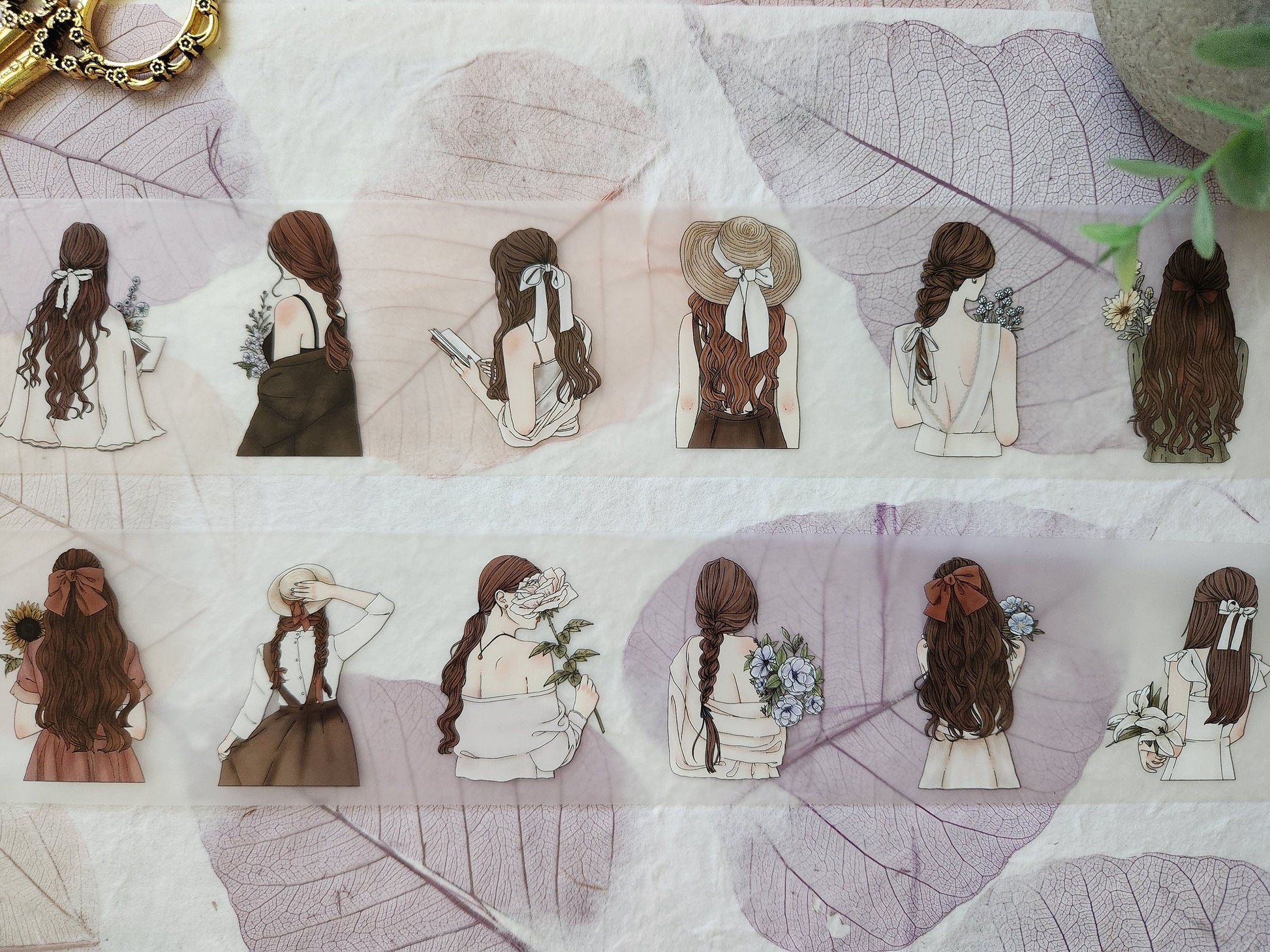 Aesthetic Girls pet tape sample loop, featuring 12 different designs/girls. Use for a variety of projects for your scrapbook, junk journal, and even greeting cards.