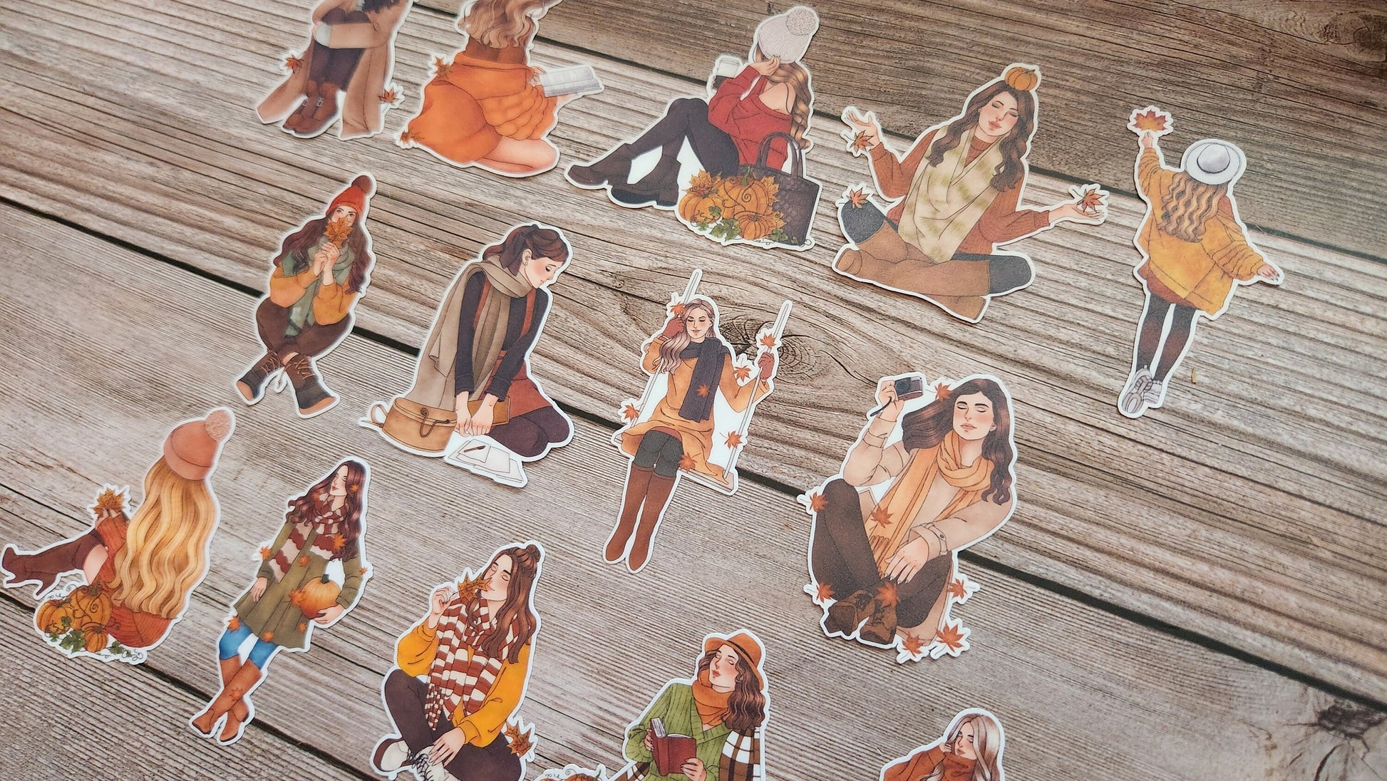 You will receive 1 set of 14 lovely autumn dreams girl stickers all unique designs, and cut out ready to be used for your projects.
