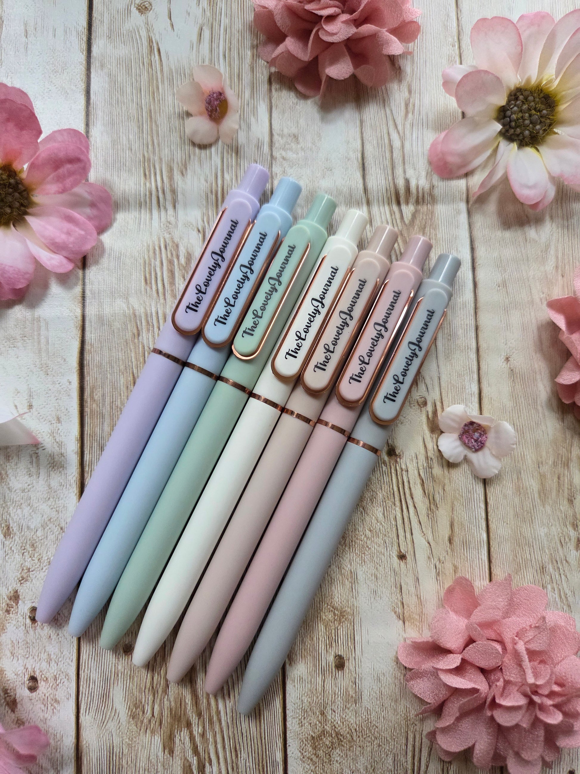 Lovely Journal Pens featuring 7 pastel colors including: Lilac, Baby blue, Mint, Cream, Nude, Rose, and Gray.